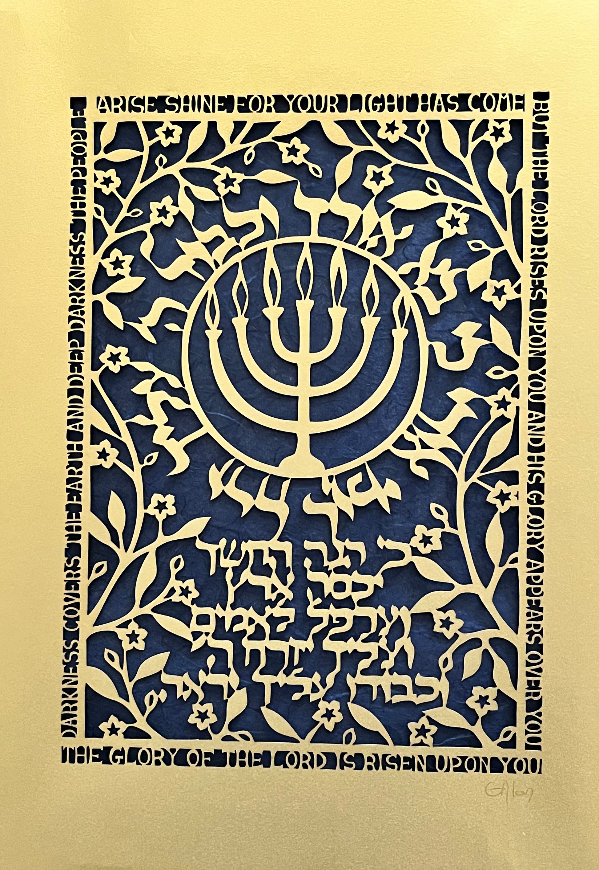 "Arise shine, for your Light has come. The Glory of the Lord has risen upon you. Darkness covers the Earth and deep darkness the people. But the Lord rises upon you and His Glory appears over you." What words could more beautiful for Israel in today's dark world? This gorgeous laser paper cut in matte gold foil features a lighted Temple Menorah and floral vines. Created in and assembled Israel and shipped from the United States. 11'X14" ready for framing. Ready-made frames are available to fit at major retailers across the USA.